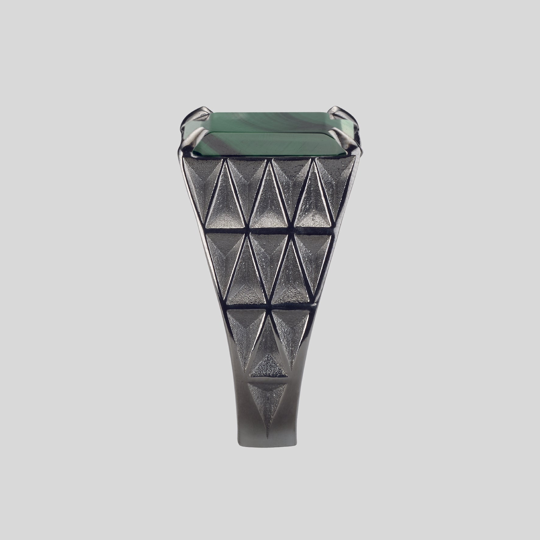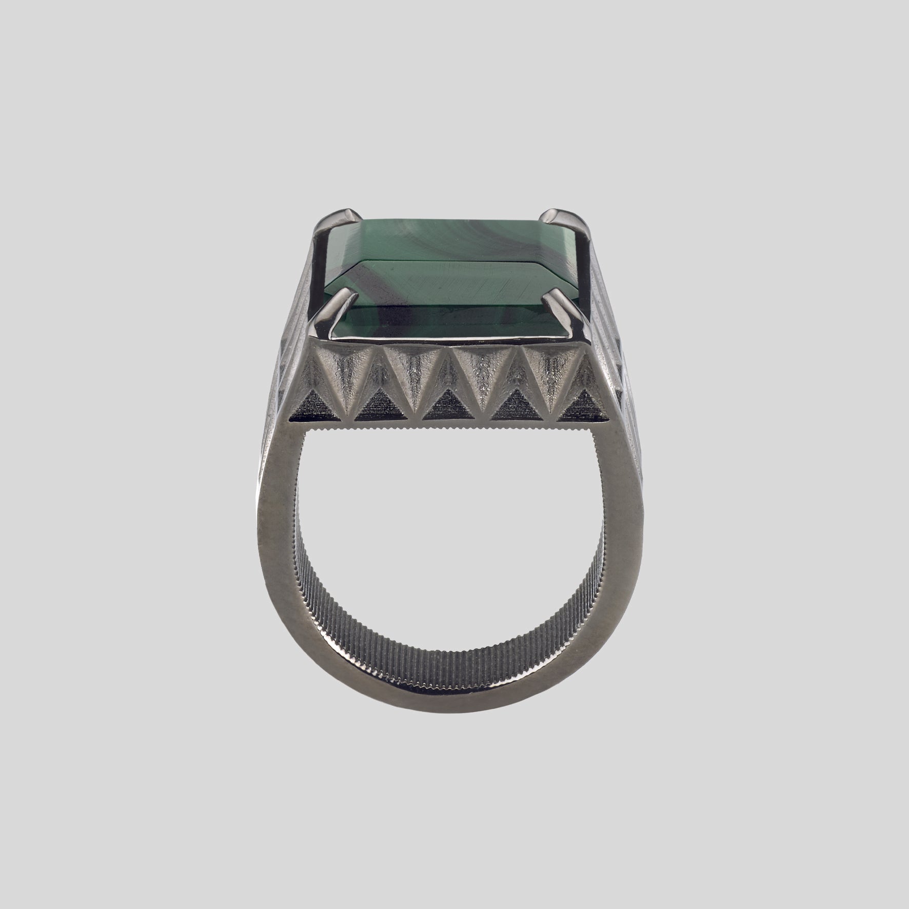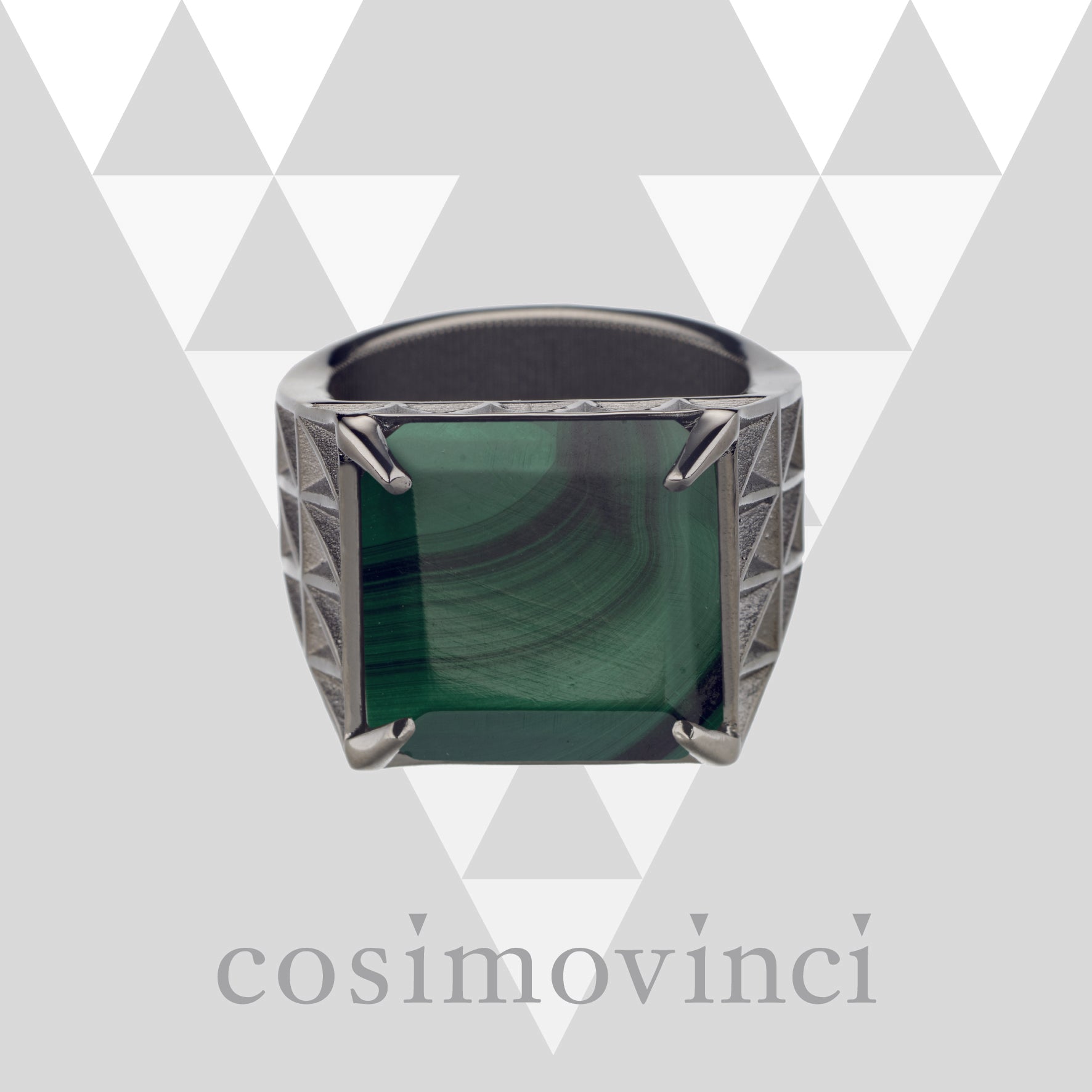 The stones that adorn the ring, with their transparency and brightness, amplify this geometric effect, making the "V" pattern shine like a diamond that captures and reflects light in a unique way. Every angle, every surface of the ring seems to be designed to enhance this play of reflections, making the object a tangible symbol of a path to excellence and success.