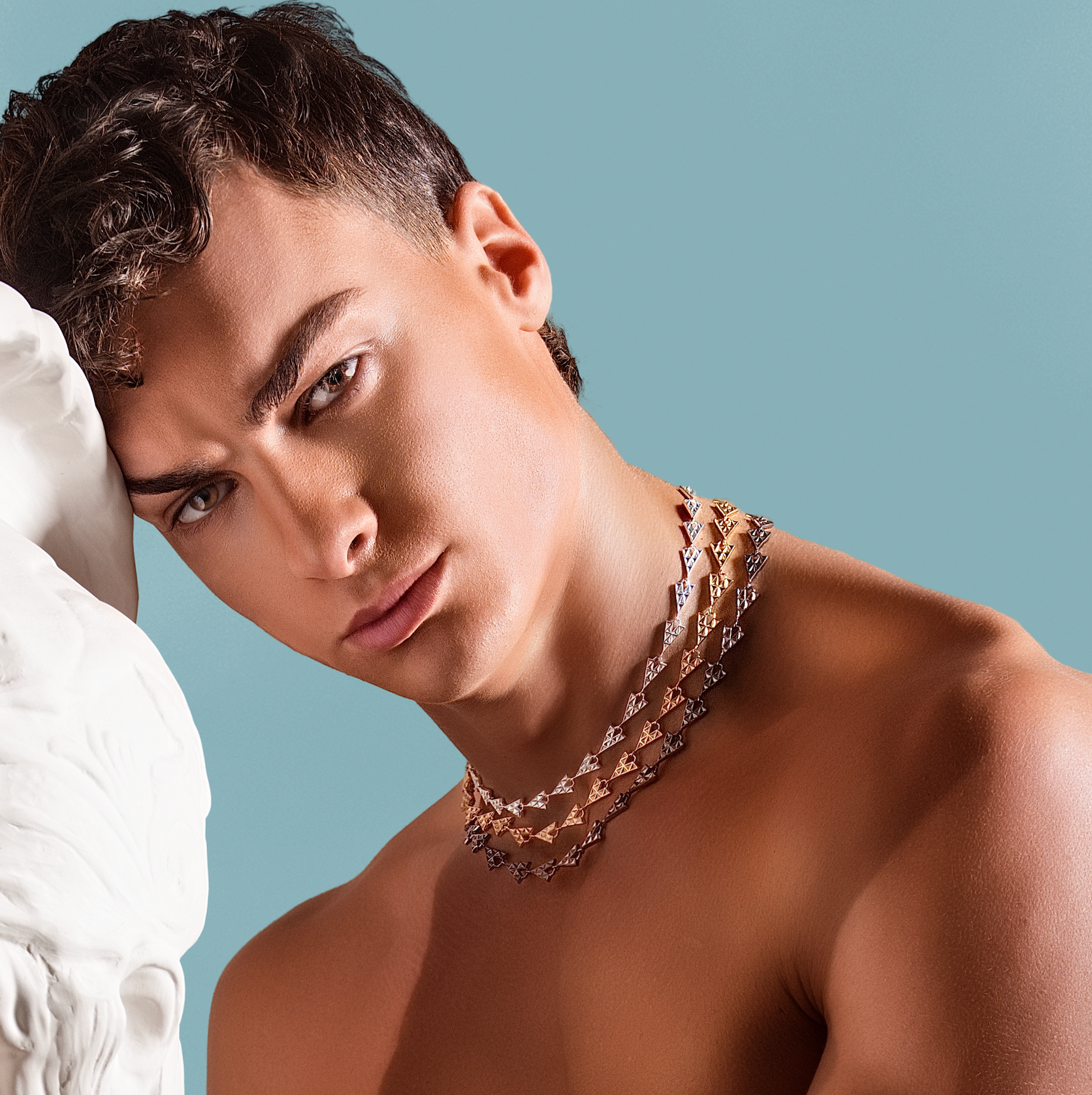 Collana in argento 925 con placcatura in oro 24k (1 micron), composta da multiple V Prisma assemblate in una catena dal forte impatto visivo. Un design iconico e riconoscibile, ispirato alla V Prisma sfaccettata, simbolo distintivo della collezione V Prisma One.