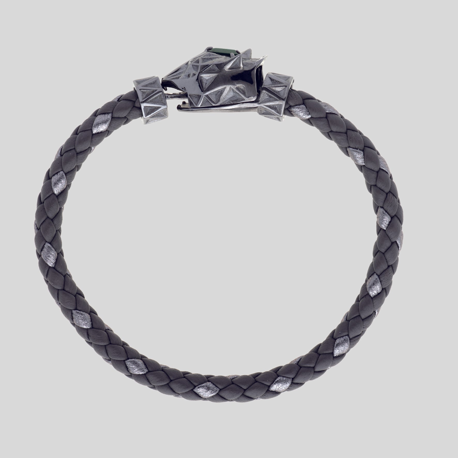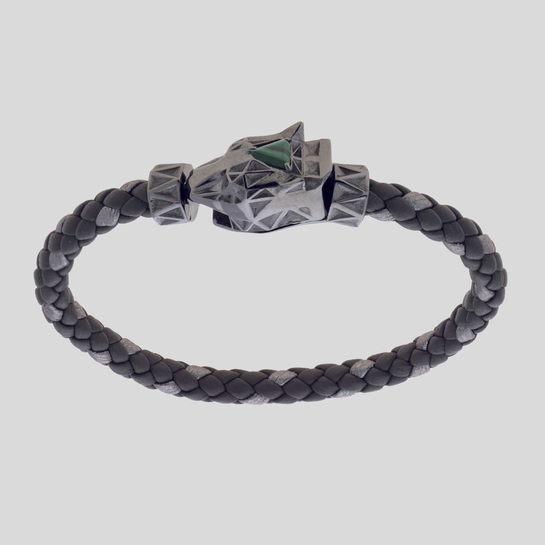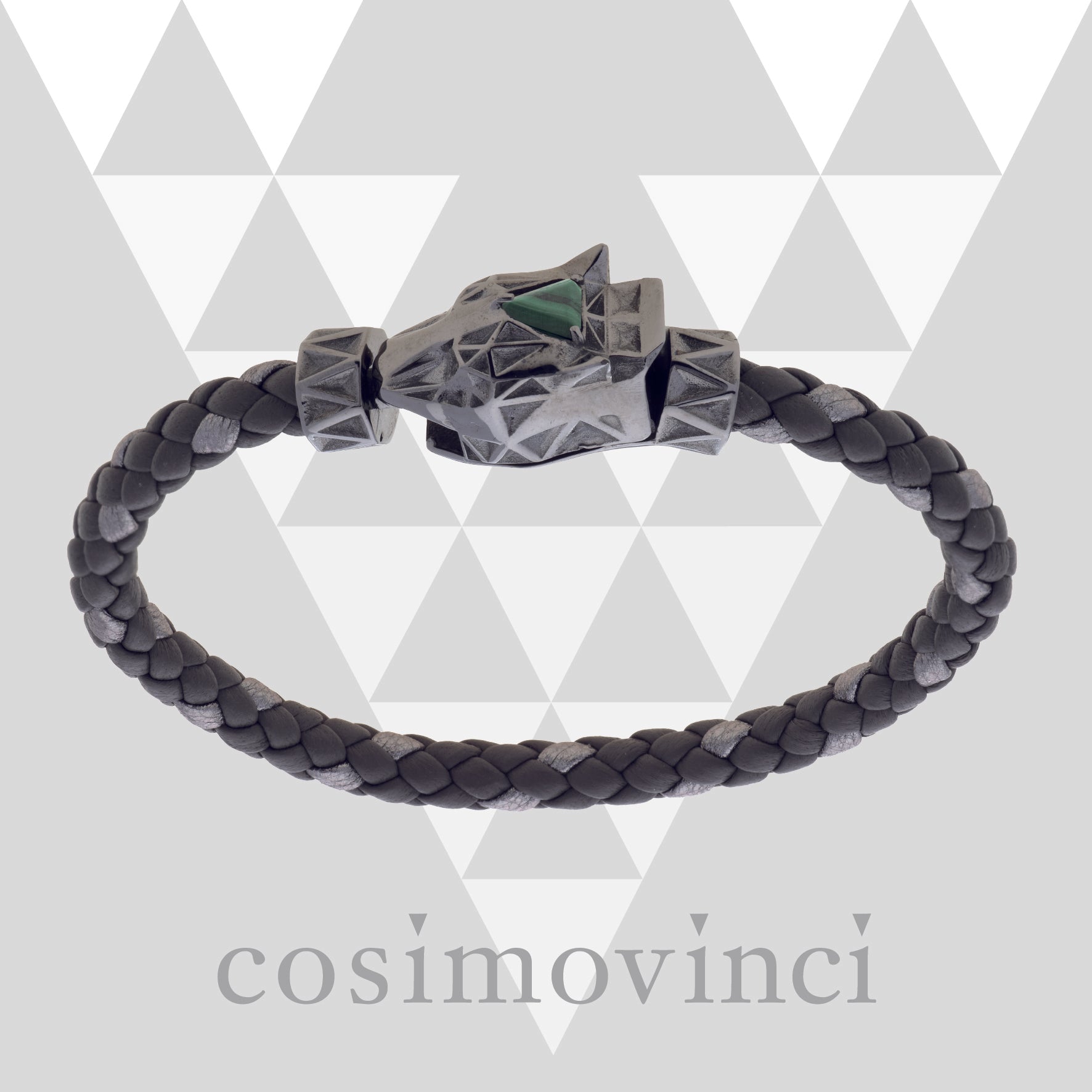 Bracciale con chiusura animata argento brunito 925, Malachite naturale, taglio triangolare 6x6, scubidù in vera pelle opaca colore fog (5 fili) e laminato titanium (un filo).