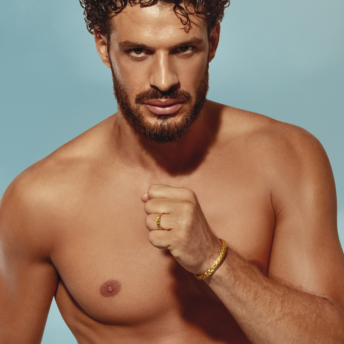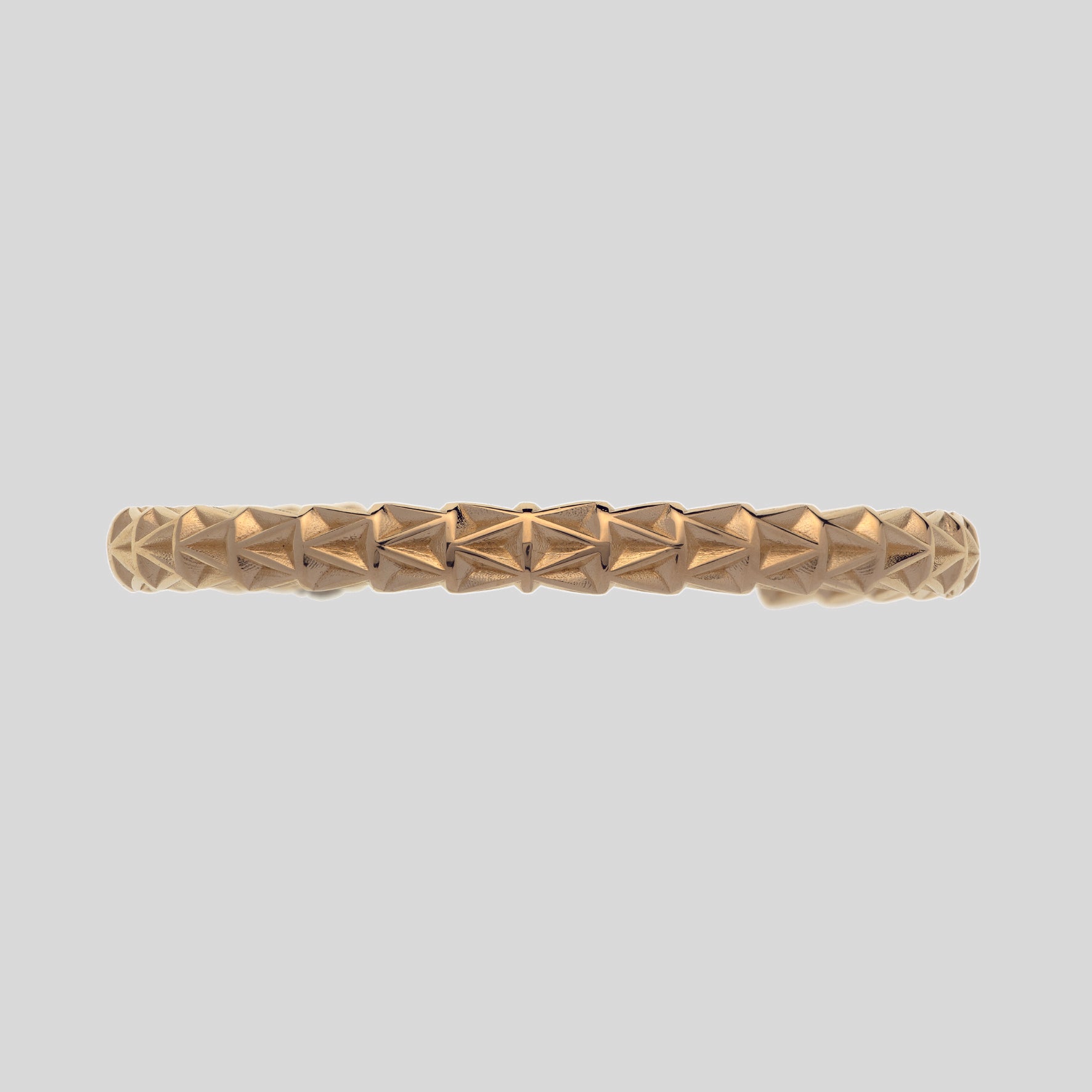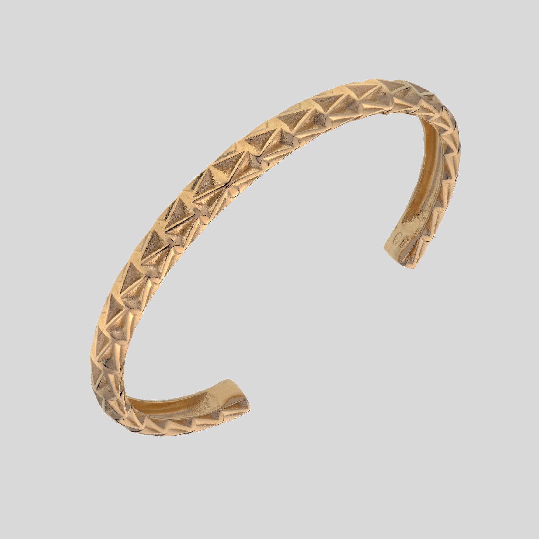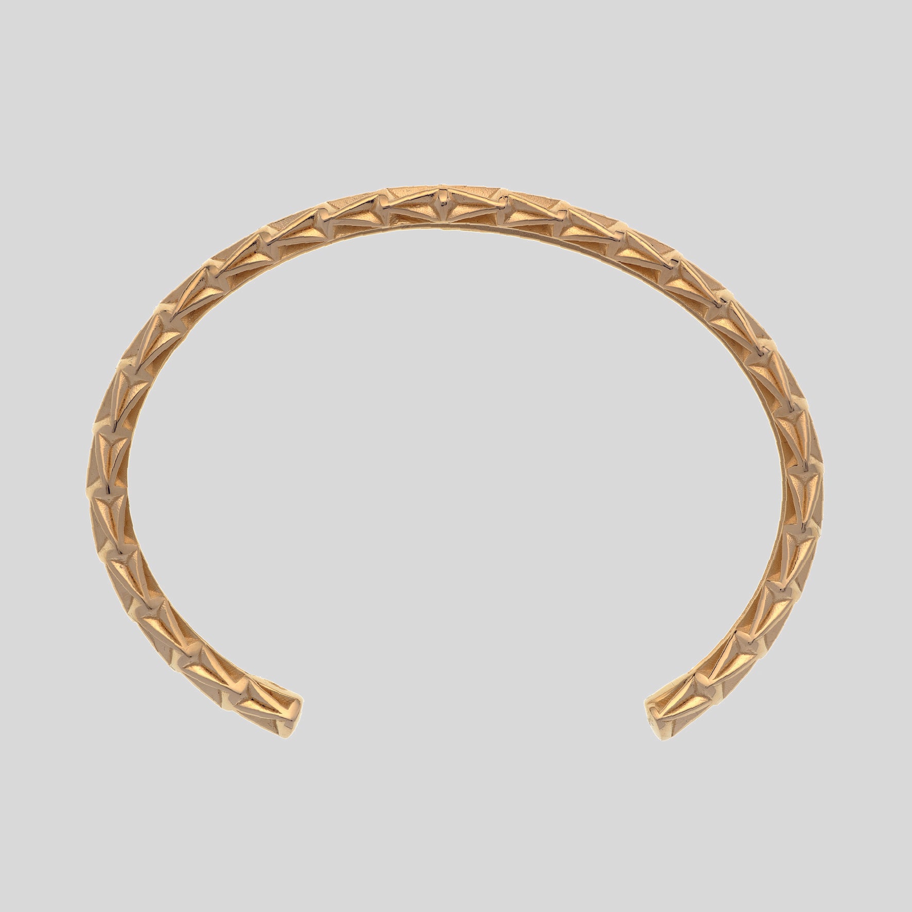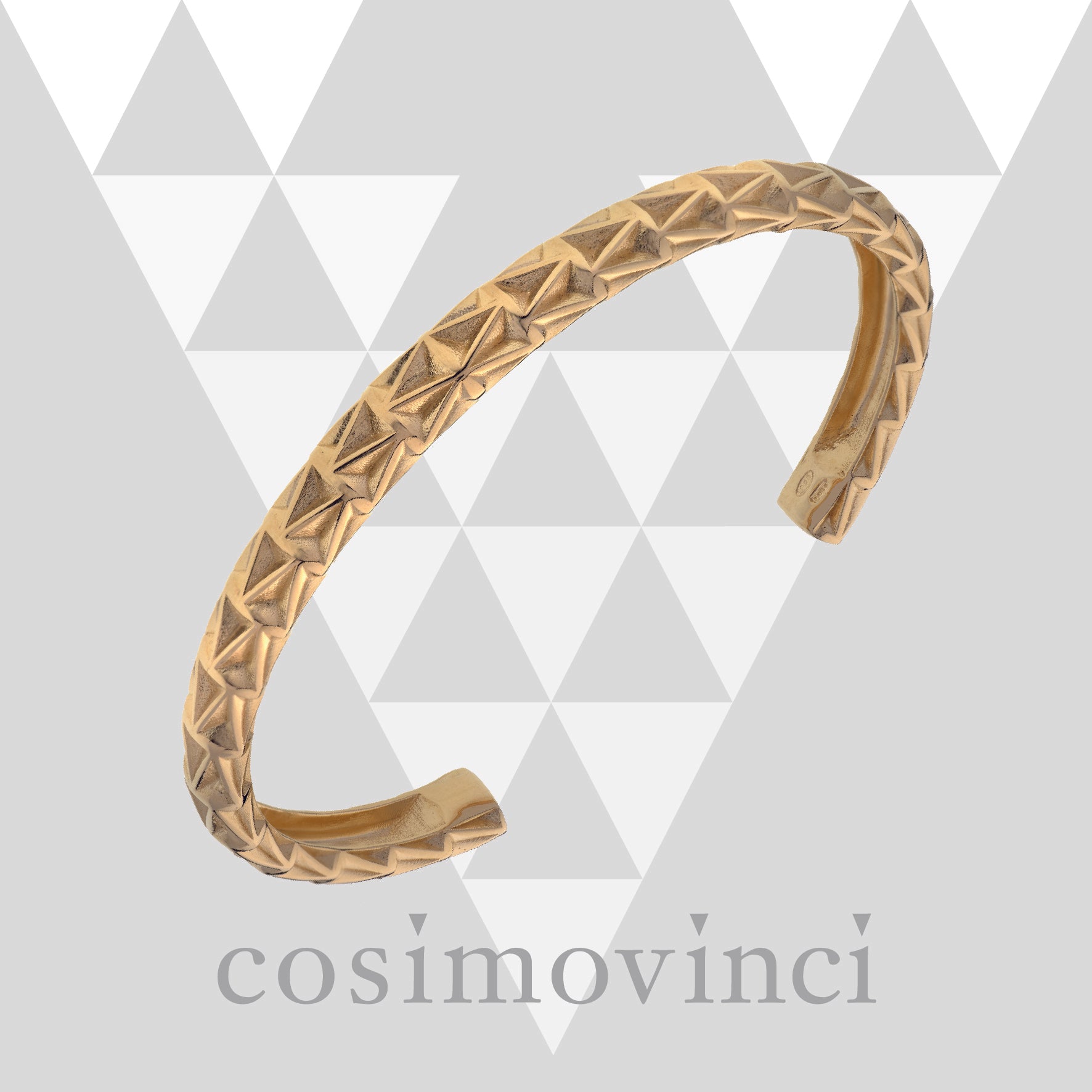 Il motivo a V crea una texture simmetrica che avvolge il polso con forza ed equilibrio, ispirata alle antiche armille romane: bracciali-talismano indossati dai gladiatori come amuleti di protezione e potenza.